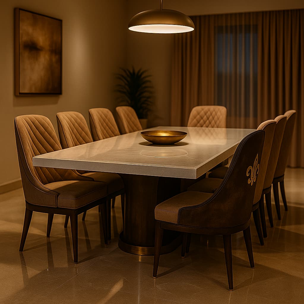 Bring home unmatched luxury with this modern 10-seater dining table, designed for families who love hosting in style. The elegant white marble-finish tabletop, paired with diamond-stitched cushioned chairs, gives a perfect blend of comfort and sophistication.