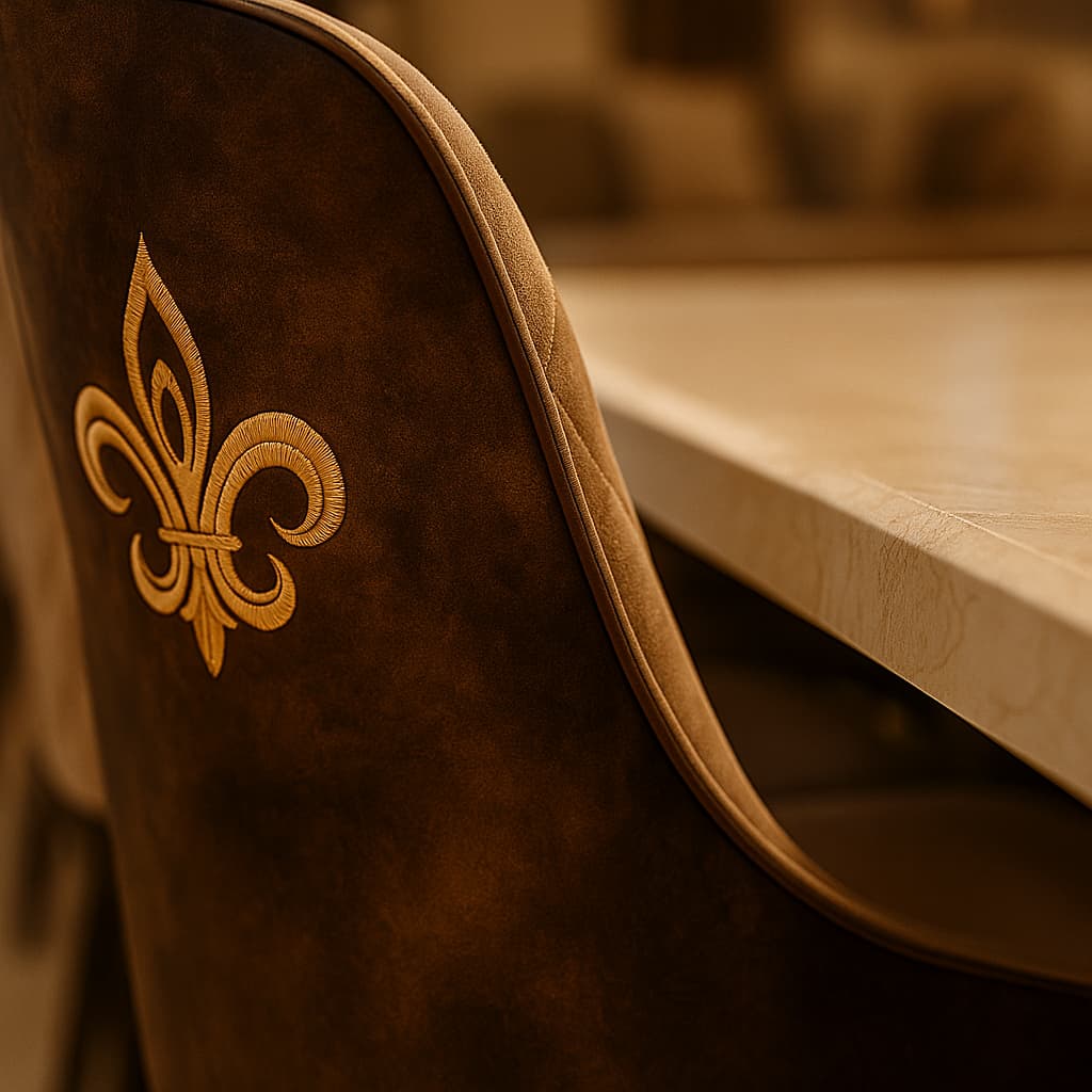 The rich coffee-brown royal chair with emblem detailing adds a premium touch, making this set a true centerpiece for any dining space.