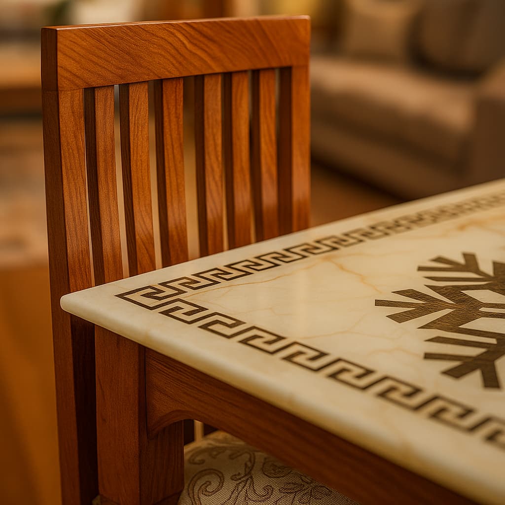 This premium dining table features a high-quality marble-finish top with intricate central inlay work that adds a luxurious touch. Crafted from strong hardwood, it ensures long-lasting durability while maintaining a rich natural wood grain look.