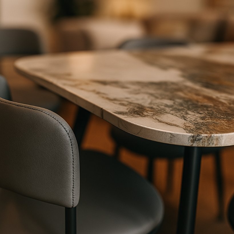 A stylish 4-seater dining set designed for modern homes, featuring a sleek natural marble top, rounded-edge design, and soft cushioned chairs for exceptional comfort. Perfect for apartments, breakfast areas, and cozy dining spaces.
