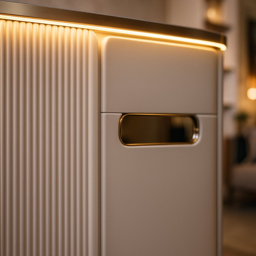 A modern-luxury TV unit crafted with a stunning marble-finish LED wall panel and a premium console featuring gold accents and fluted shutters. A perfect upgrade to elevate your living room with a warm, elegant glow.