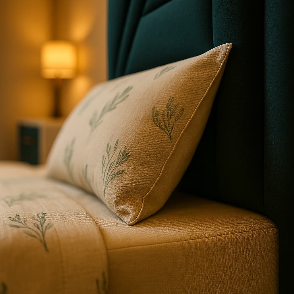 The bold teal upholstered headboard features a geometric panel design, adding striking visual depth and premium modern aesthetics. Its soft-touch velvet fabric paired with the ivory-teal dual-tone frame enhances the room’s ambiance, making it an unmistakable statement piece.