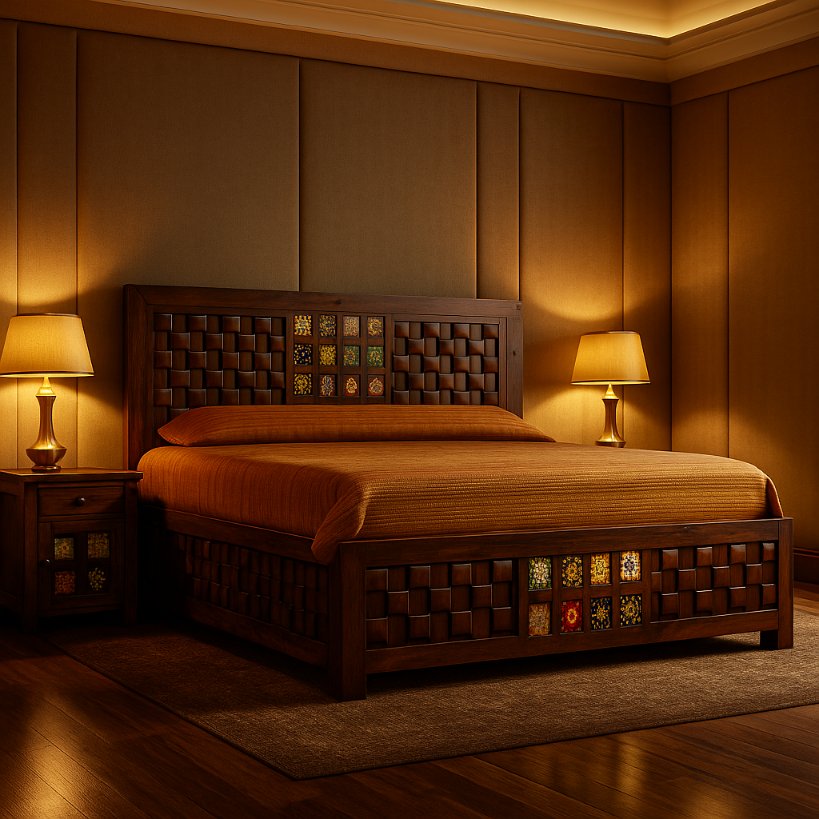 A stunning Sheesham wood bed featuring a handcrafted woven-panel design combined with vibrant hand-painted ceramic tiles. This artistic fusion of texture, craftsmanship, and color adds a luxurious heritage charm to your modern bedroom.