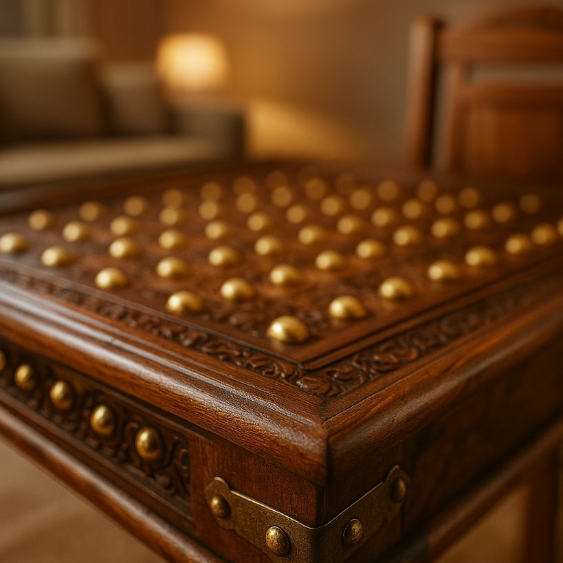 A premium Sheesham wood dining set featuring a handcrafted brass-stud tabletop and elegant turned legs. The traditional carved back chairs perfectly complement the rich Indian heritage aesthetic — ideal for homes that love timeless craftsmanship.