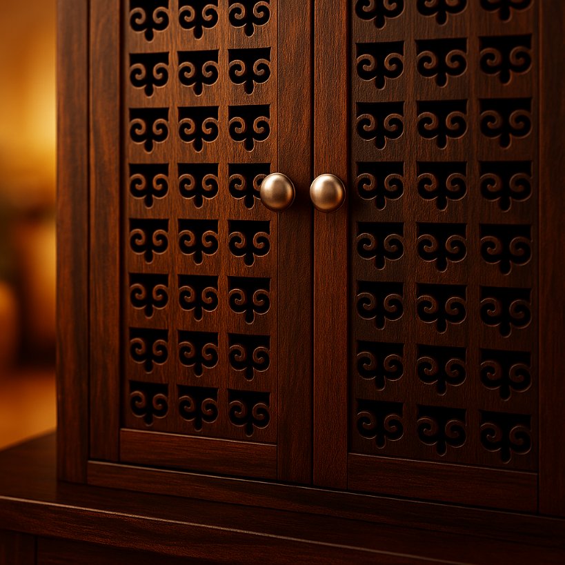 A beautifully handcrafted Sheesham wood temple designed to bring serenity and devotion into your home. Featuring intricate carved panels, a spacious sanctum, and a grand pedestal base—this mandir radiates warmth, elegance, and spiritual charm, perfect for any Indian household.