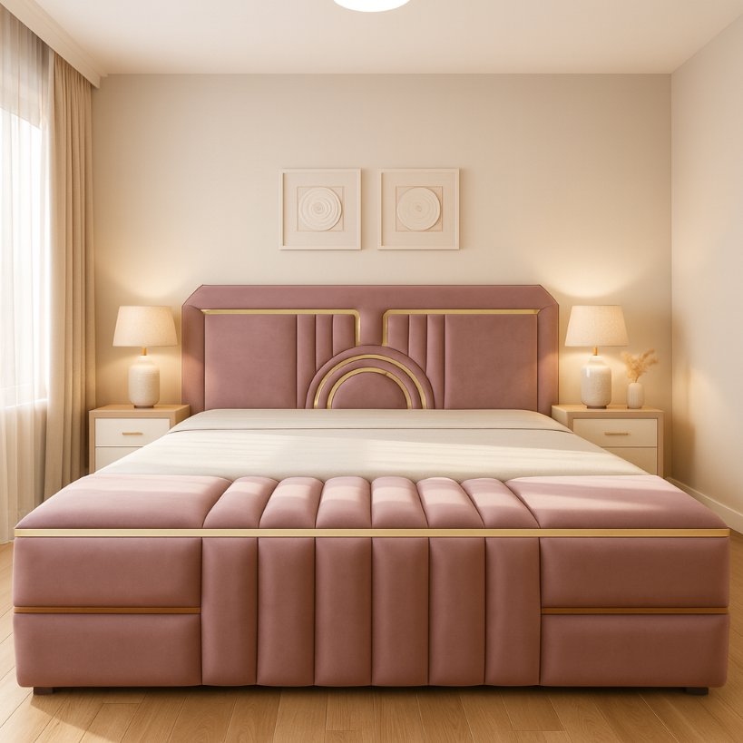 A sophisticated upholstered bed featuring an elegant curved headboard with premium gold accent detailing. Designed to deliver both visual elegance and superior comfort, this bed adds a refined, hotel-style luxury feel to modern bedrooms.
